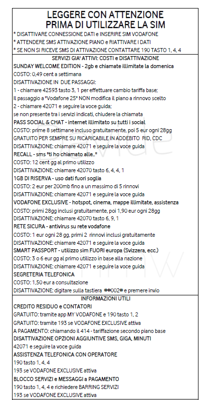 In caso di attivazione di una SIM senza offerta principale attiva (se si riesce a trovare un rivenditore che lo permette) invece, il piano base è “Vodafone 19” che prevede un canone di 1,96 euro al mese.