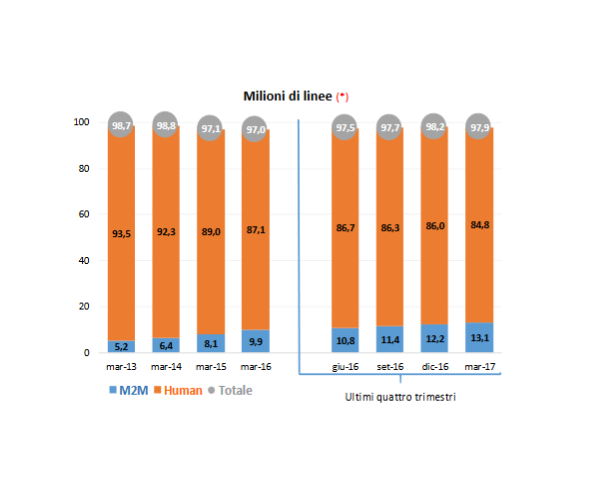 La crescita delle linee complessive è stata pari a 0,9 milioni da dicembre 2016 a marzo 2017, ma sono diminuite di 2,3 milioni le SIM tradizionali (chiamate anche SIM human, che sono destinate solo al traffico voce o al traffico voce-dati). A crescere di ben 3,2 milioni di unità sono state proprio le SIM M2M. Questo mercato è in continua crescita anche in Italia; in quattro anni il numero la diffusione di questa tecnologia è più che raddoppiata: da 5,2 milioni a marzo del 2013 a 13,1 nel marzo 2017.