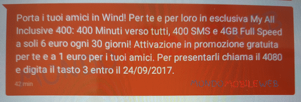 Ecco sms inviato ai già clienti Wind selezionati: “Porta i tuoi amici in Wind! Per te e per loro in esclusiva My All Inclusive 400: 400 Minuti verso tutti, 400 SMS e 4GB Full Speed a soli 6 euro ogni 30 giorni! Attivazione in promozione gratuita per te e a 1 euro per i tuoi amici. Per presentarli chiama il 4080 e digita il tasto 3 entro il 24/09/2017“.