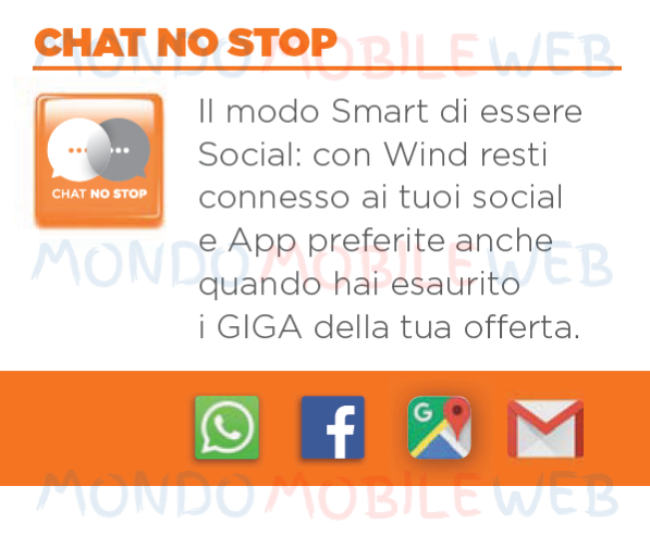 Wind, dal 6 Maggio 2018, con il ritorno del testimonial Rosario Fiorello, ha rinnovato graficamente il pay-off “Più Vicini”. L’azienda di telecomunicazione Wind Tre ha deciso di rinominare, nei suoi fogli informativi, “Internet Illimitato” in “Chat No Stop” per sottolineare ai suoi clienti Wind che con molte offerte ricaricabili (come ad esempio la gamma All Inclusive) è possibile chattare nelle principali piattaforme social senza pensieri anche quando si consumano i Giga della propria offerta.