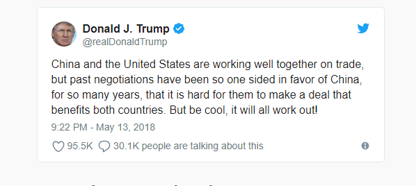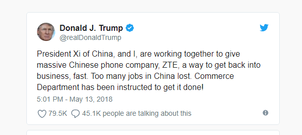 Nonostante i rapporti tesi, il 13 Maggio 2018, il Presidente degli Stati Uniti d’America dichiara di aver cambiato idea, aiutando ZTE nella ripresa economica visto che negli ultimi tempi la Cina sta subendo molte perdite di posti lavoro. Su Twitter è possibile leggere le parole di Trump che afferma di lavorare insieme al Presidente cinese XI JinPing.