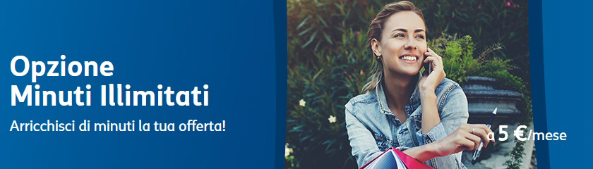 L’opzione aggiuntiva minuti illimitati, consente di avere minuti illimitati, verso tutti i numeri mobili e di rete fissa, in Italia e, secondo il Regolamento UE n. 2016/2286, in tutta Europa, e ha un costo di 5 euro al mese. Il costo dell’opzione, ovviamente, si aggiunge a quello dell’offerta base del cliente. L’attivazione è gratuita.
