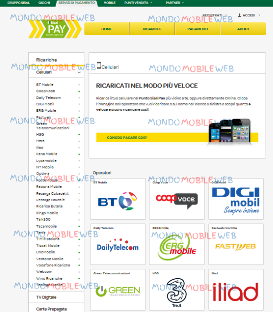 Selezionando Iliad nella lista degli operatori di cui richiedere una ricarica telefonica il sito www.sisalpay.it riporta: