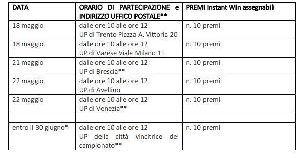- instant win consistenti in una canotta Serie A da Basket, ai partecipanti al Concorso che, compilando l’apposito form elettronico visualizzeranno la dicitura “Hai Vinto”. Gli instant win saranno assegnati presso gli Uffici Postali delle città coinvolte nei giorni assegnati. Saranno messe in palio 10 magliette per ognuno dei 5 Uffici Postali, più altre 10 canotte per l’Ufficio della città vincitrice.