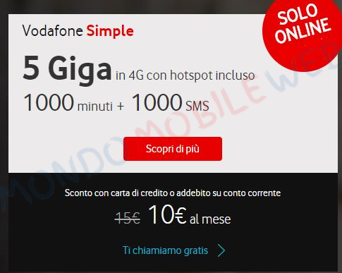 Vodafone Simple offre 1000 minuti, 1000 SMS e 5 Giga in 4G con hotspot incluso al prezzo di 10 euro al mese, e non prevede alcun costo di attivazione.