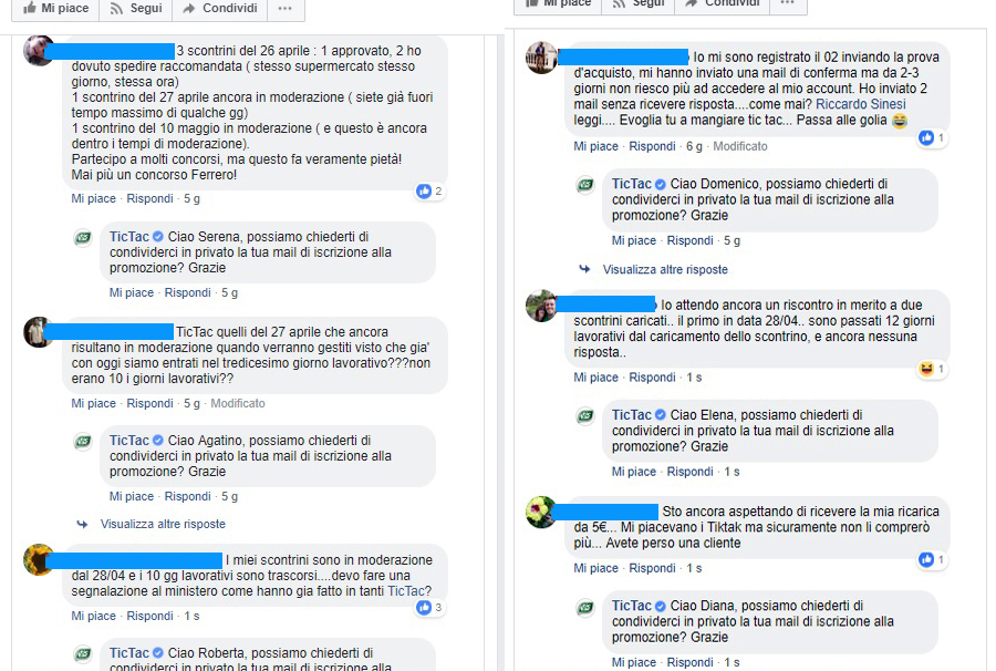La pagina Facebook “Tic Tac italy” è costantemente bersagliata da post di clienti che chiedono lumi sui tempi di ricezione del codice per la ricarica, e tra loro c’è addirittura chi, inviando tre scontrini, ne ha visto approvare solo uno.