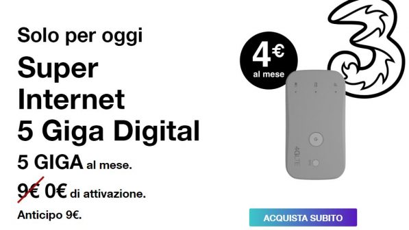 Per tutti i nuovi Clienti che attivano l’offerta online tramite 3Store Web non è previsto un costo di attivazione. Per i nuovi Clienti che attivano Super Internet 5GB Digital, il costo del primo mese è pari a 2 euro e sarà addebitato il mese successivo a quello di attivazione.