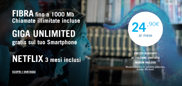 Se si attiva la promo web in fibra (FTTC o FTTH), vengono scontate sia le 48 rate da 2 euro ciascuna del modem che l’opzione Voce Unlimited per le chiamate illimitate (anziché 5 euro al mese), lasciando così il costo dell’offerta a 24,90 euro al mese a tempo indeterminato.