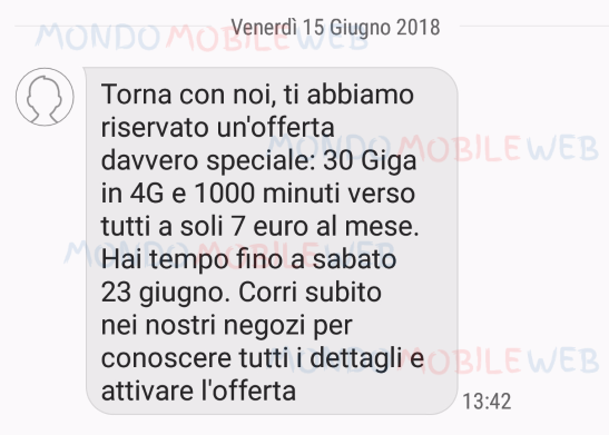 Ecco l’sms informativo: “Torna con noi, ti abbiamo riservato un’offerta davvero speciale: 30 Giga in 4G e 1000 minuti verso tutti a soli 7 euro al mese. Hai tempo fino a sabato 23 Giugno 2018. Corri subito nei nostri negozi per conoscere tutti i dettagli e attivare l’offerta“.
