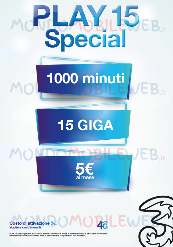 - Vieni a scoprire PLAY15 Special! 15 GIGA e 1000 minuti a 5 euro al mese. Ti aspettiamo nei 3Store fino al 26/6 per dettaglio costi e per tornare in 3;