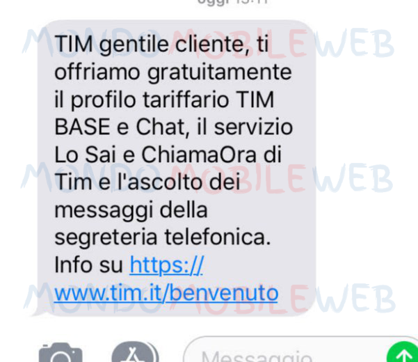 Ecco l’sms inviato: “TIM gentile cliente, ti offriamo gentilmente il profilo tariffario TIM Base e Chat, il servizio Lo Sai e ChiamaOra di TIM e l’ascolto dei messaggi della segreteria telefonica. Info su https://www.tim.it/benvenuto“.