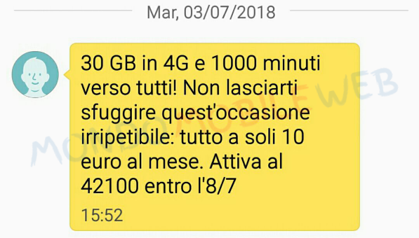 Ecco l’sms inviato ad alcuni già clienti Vodafone selezionati con un’offerta dati attiva: “30GB in 4G e 1000 minuti verso tutti! Non lasciarti sfuggire quest’occasione irripetibile: tutto a 10 euro al mese. Attiva al 42100 entro il giorno 08/07“.