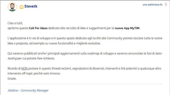 Di seguito, il post all’interno dell’area MyTIM della community, pubblicato da Stefano, Community Manager: