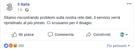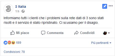AGGIORNAMENTO ORE 15:49: Con un secondo post sulla sua pagina facebook ufficiale, l’operatore informa tutti i clienti che i problemi sulla sua rete dati sono stati risolti e il servizio ripristinato. La comunicazione ufficiale è la seguente: “Informiamo tutti i clienti che i problemi sulla rete dati di 3 sono stati risolti e il servizio è stato ripristinato. Ci scusiamo per il disagio.”