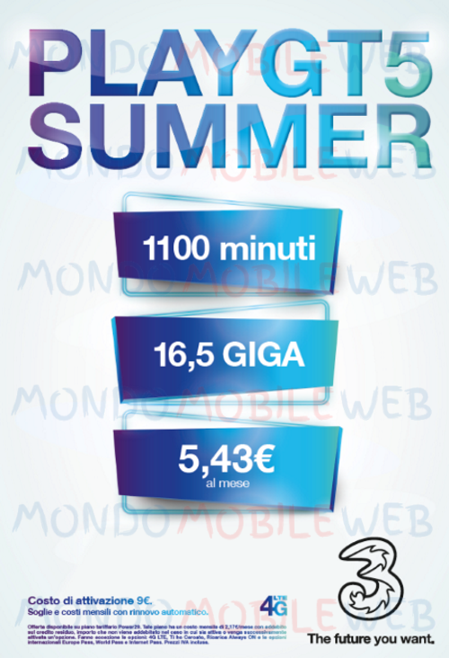 Si ricorda che l’offerta Play GT5 Summer sarà attivata su piano tariffario Power29. Tale piano ha un costo mensile di 2,17 euro al mese con addebito sul credito residuo, importo che non viene addebitato nel caso in cui sia attiva o venga successivamente attivata un’opzione. Fanno eccezione le opzioni: 4G LTE, Ti ho Cercato, Ricarica Always ON e le opzioni internazionali Europe Pass, World Pass e Internet Pass.