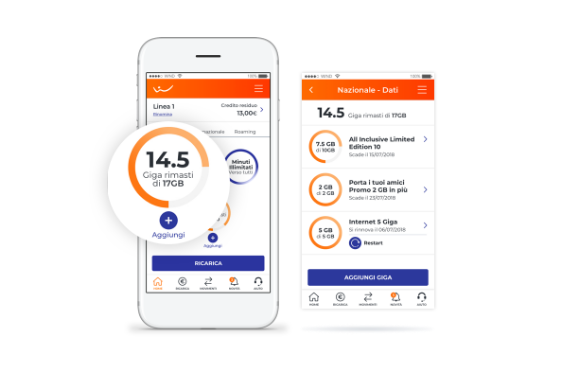 - Visualizzare il totale e i dettagli delle proprie offerte, con la possibilità di aggiungere minuti, SMS e Giga o scegliere di rinnovare in anticipo la tua offerta (RESTART)