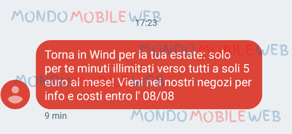 Ecco un esempio di sms inviato: “Torna in WIND per la tua estate: solo per te minuti illimitati verso tutti a soli 5 euro al mese! Vieni nei nostri negozi per info e costi entro l’08/08