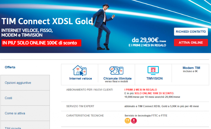 - 29,90 euro ogni mese per TIM Connect XDSL Gold con chiamate illimitate;