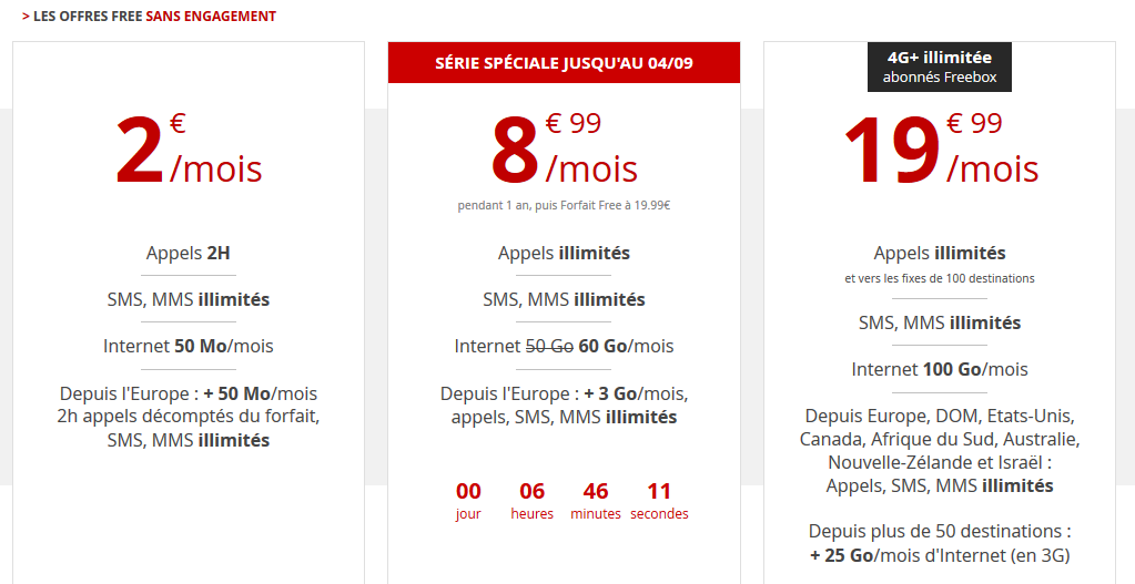 L’azione non è stata meno aggressiva nel mobile. Constatando una perdita di 70.000 linee, Free ha lanciato ad inizio Luglio un‘offerta che a 8,99 euro al mese (prezzo valido per un anno, al termine del quale si attiva la Unlimited 4G+ a 19,99 euro al mese) propone minuti ed sms illimitati, 50 Gb e 3 Gb a disposizione quando si viaggia in Europa. La possibilità di attivarla si interromperà, salvo ulteriori proroghe, quest’oggi allo scoccare della mezzanotte (un’offerta che di fatto si assomiglia molto a quella a 6,99 euro che Iliad ha lanciato nello stesso mese in Italia).