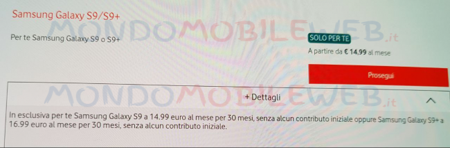Alcuni clienti ci hanno segnalato che, nell’App MyVodafone, è disponibile una nuova offerta per acquistare i Samsung Galaxy S9 ed S9+ al costo rispettivamente di 14,99 euro e 16,99 euro al mese per 30 mesi con un contributo iniziale di 0 euro.