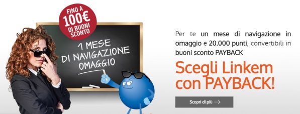 Gli utenti iscritti al programma fedeltà multipartner PayBack che decidono di attivare un nuovo contratto Linkem entro il 1° Ottobre 2018, salvo ulteriori proroghe, potranno godere di un mese di navigazione in omaggio e 20.000 punti PAYBACK, convertibili in buoni sconto presso Carrefour, Esso, Mondadori Store, GrandVision, American Express Viaggi, Caffitaly e 101CAFFÈ.