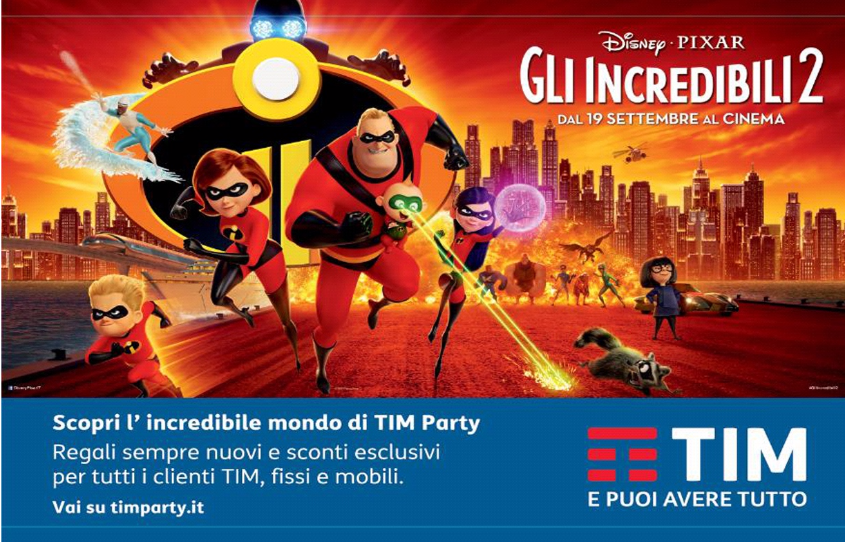 Tim, in associazione con The Walt Disney Company Italia S.r.l., ha indetto, mediante il programma fedeltà Tim Party, un concorso denominato “Gioca con TIM Party e Gli Incredibili 2 e vola a Barcellona con tutta la famiglia!”, con scadenza il 29 Settembre 2018, che permette di vincere gadget del film Disney Pixar “Gli Incredibili 2” e un viaggio a Barcellona.