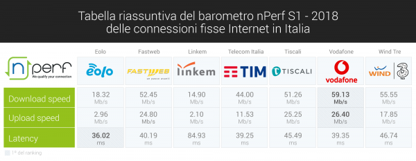 Dalle informazioni di questo barometro si può concludere quindi affermando che, per quanto concerne la velocità di download e upload, la rete Vodafone, almeno per questo primo semestre 2018, ha primeggiato su tutte le altre. Discorso un pò diverso per la latenza, dove invece a distinguersi è stata Eolo, ma con tutti gli altri operatori molto vicini. Solo Linkem si è distanziata parecchio con valori ancora troppo alti.
