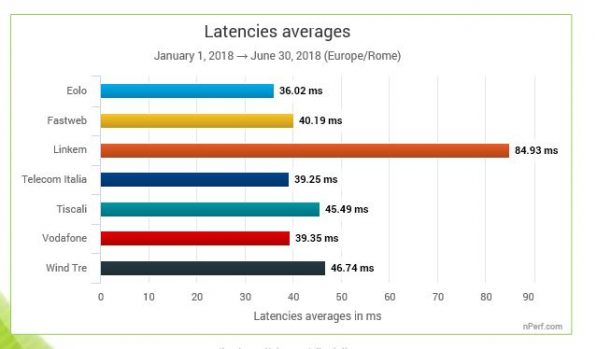 Il miglior risultato, in termini di latenza, è stato raggiunto da Eolo con 36.02 ms, ma questa ottima prestazione si deve mettere in relazione con il numero di abbonati, di certo molto inferiore ad altri operatori. Linkem, con 84,93 ms, ricopre invece il gradino più basso della classifica, mentre TIM e Vodafone mostrano valori di latenza molto incoraggianti, considerando la rispettiva quota di mercato. Dal Gennaio al Giugno 2018, la latenza media in Italia è stata di 42.48 ms.