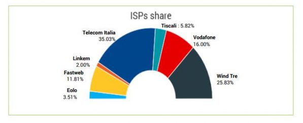 Per le reti fisse, la ripartizione globale dei test per operatore, vede Tim con una quota del 35,03%, seguita da Wind Tre con il 25,83%, Vodafone con il 16%, Fastweb con l’ 11,81%, Tiscali con il 5,82%, seguono poi Eolo con il 3,51% e Linkem con il 2%.