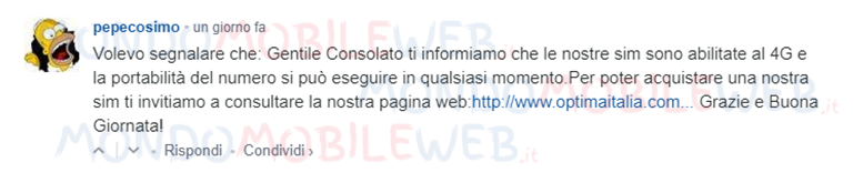 Grazie alla segnalazione dell’utente pepecosimo all’interno della sezione dei commenti della Community di MondoMobileWeb, il sito interattivo dei consumatori italiani sulla telefonia, si è infatti scoperto che, su richiesta dell’utente tramite i canali social, Optima Mobile ha confermato la possibilità di poter navigare anche in 4G.