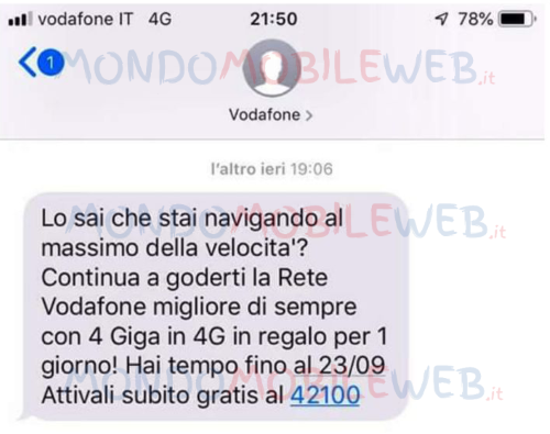 Ecco l’sms inviato ad alcuni clienti Vodafone coinvolti: “Lo sai che stai navigando al massimo della velocità? Continua a goderti la Rete Vodafone migliore di sempre con 4 Giga in 4G in regalo per 1 giorno! Hai tempo fino al 23/09. Attivali subito gratis al 42100“.
