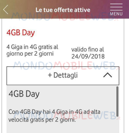 La promozione 4GB Day offre 4 Giga in 4G al giorno per 2 giorni. La versione 4GB Day in regalo è valida per 48 ore dall’attivazione. Per esempio il cliente Vodafone che è riuscito ad attivare 4GB Day il 23 Settembre 2018, potrà utilizzare la promo fino al 25 Settembre 2018.