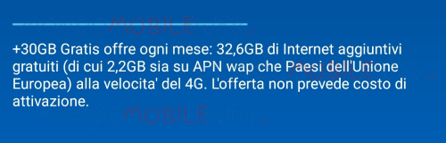 Come è possibile leggere, l’offerta chiamata +30GB Gratis offre nello specifico 32,6 GB di internet aggiuntivi gratuiti, dopo l’adeguamento del bundle per l’allineamento al rinnovo a data certa, di cui 2,2GB anche all’interno dell’Unione Europea. I Giga aggiuntivi sono in 4G e l’offerta non prevede alcun costo di attivazione.