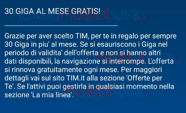Se fino alla settimana scorsa la promozione si attivava in automatico con alcune offerte tariffarie (come ad esempio: Tim Special Top 50GB, Tim Ten One Go 50GB, Tim Ten One Go 20GB, Tim 7 ExtraGo New), questa volta la promozione “30 Giga al mese gratis” viene proposta all’interno dell’App MyTim Mobile nella sezione “Offerte Per Te“.
