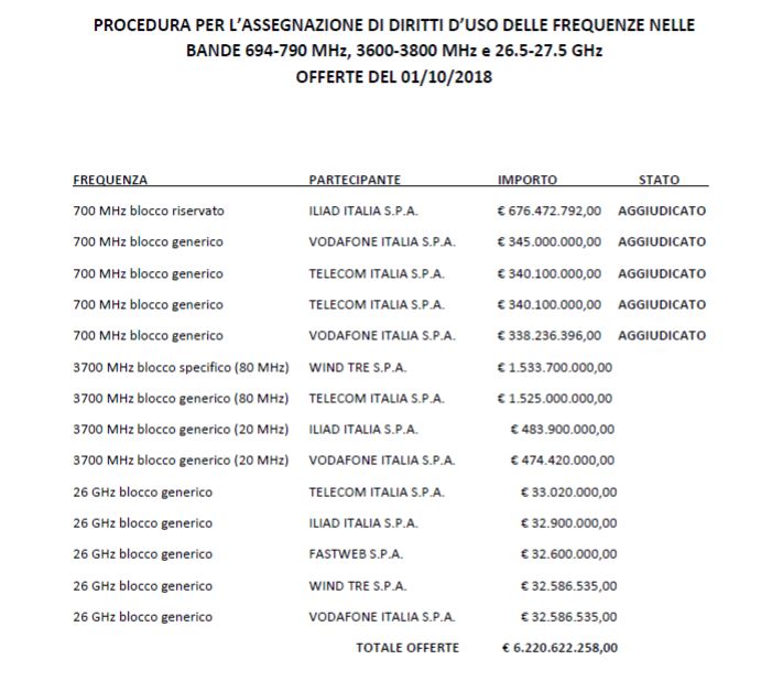 Nella giornata precedente, la tabella rilasciata dal MISE mostrava le posizioni raggiunte dagli operatori partecipanti. Senza considerare i blocchi già aggiudicati nellla frequenza 700 MHz, la banda 3700 MHz vedeva Wind Tre e TIM in testa nei due lotti da 80 MHz, rispettivamente con 1.474.200.000,00 euro e 1.525.000.000,00 euro. Nel primo dei due blocchi generici da 20 MHz trovava invece posto Iliad, con un’offerta da 381.620.000,00 euro. Il secondo blocco generico da 20 MHz, invece, presentava l’offerta di Vodafone da 374.140.000,00 euro.