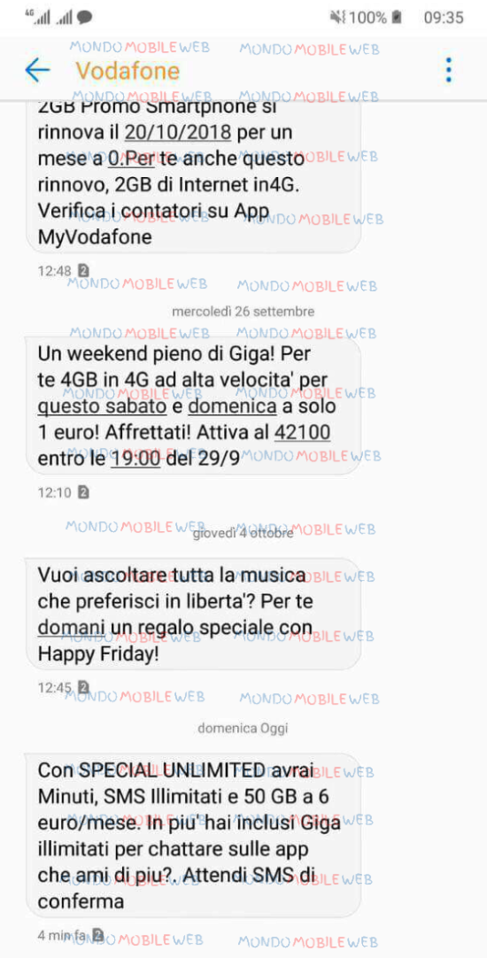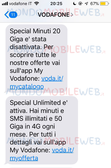 Ecco l’sms inviato ai clienti Vodafone che riescono ad attivare questa offerta: “Con Special Unlimited avrai minuti, sms illimitati e 50 GB a 6 euro/mese. In più hai inclusi Giga illimitati per chattare sulle app che ami di più. Attendi SMS di conferma“.