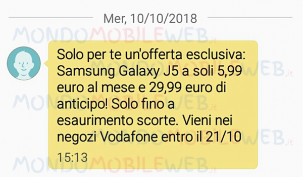 Vodafone sta inviando in questi giorni un SMS che invita a recarsi in un negozio per acquistare uno smartphone a rate: secondo le segnalazioni pervenute lo smartphone proposto è il Samsung Galaxy J5 2017, disponibile fino ad esaurimento scorte entro il 21 Ottobre 2018, salvo cambiamenti.