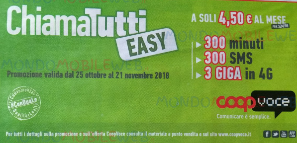 Dal 25 Ottobre al 21 Novembre 2018, salvo eventuali proroghe, tutti i nuovi e già clienti CoopVoce potranno attivare la nuova offerta ricaricabile ChiamaTutti Easy che prevede 300 minuti, 300 sms, 3 Giga in 4G a 4,50 euro al mese a tempo indeterminato.