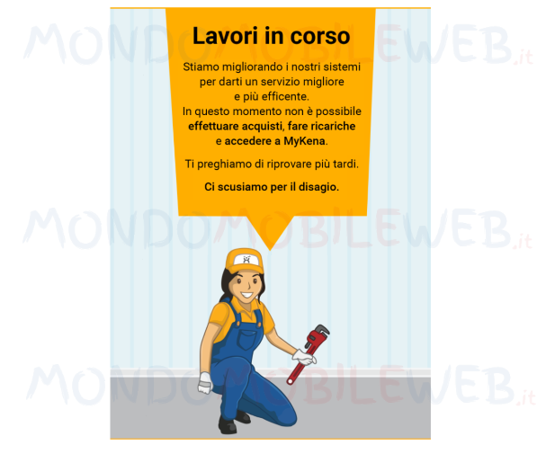 Lavori in corso. Stiamo migliorando i nostri sistemi per darti un servizio migliore e più efficente. In questo momento non è possibile effettuare acquisti, fare ricariche e accedere a MyKena. Ti preghiamo di riprovare più tardi. Ci scusiamo per il disagio