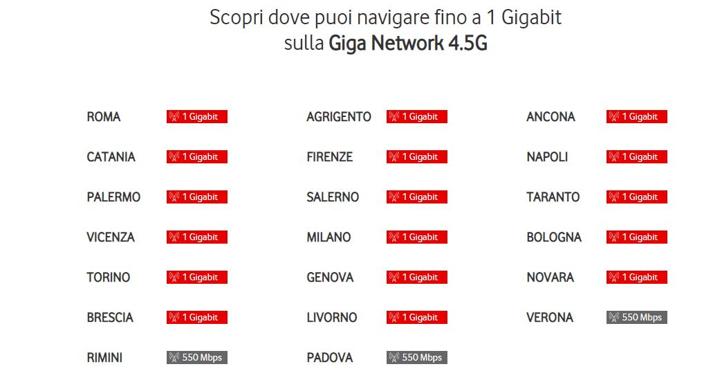 Vodafone Giga Network 4.5G: le città italiane in cui è possibile navigare fino a 1 Gigabit al secondo