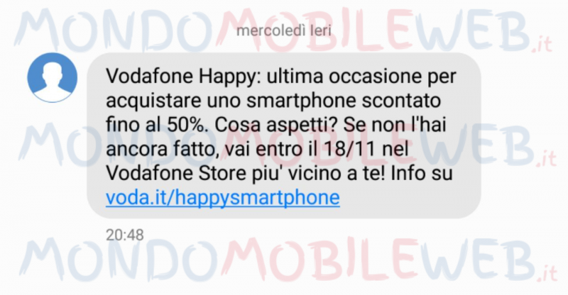 “Vodafone Happy: ultima occasione per acquistare uno smartphone scontato fino al 50%. Cosa aspetti? Se non l’hai ancora fatto, vai entro il 18/11 nel Vodafone Store piu’ vicino a te! Info su voda.it/happysmartphone”