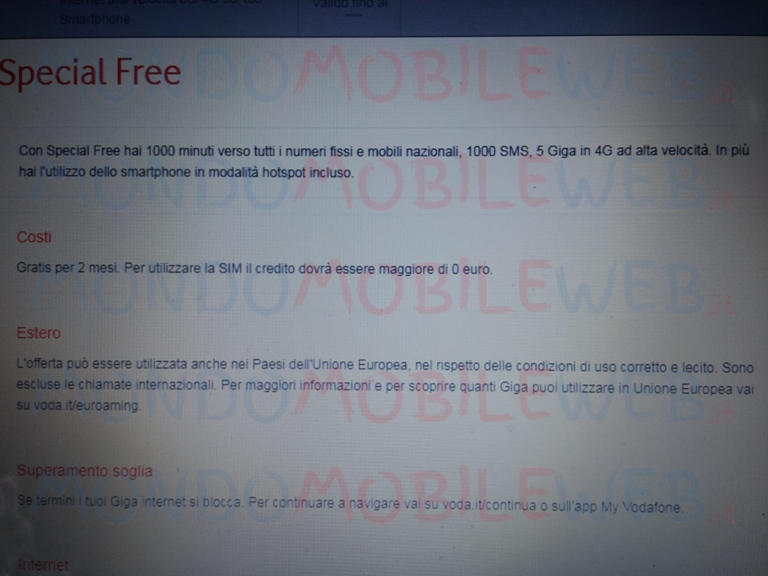 La promozione Special Free prevede 1000 minuti verso tutti, 1000 SMS verso tutti e 5 Giga di internet in 4G ogni mese, il tutto in maniera totalmente gratuita per 2 mesi dall’attivazione, poi si disattiva automaticamente senza costi aggiuntivi. Per poter usufruire dell’offerta, la SIM deve avere comunque un credito residuo maggiore di 0 euro.