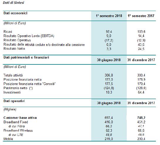 Il risultato netto del primo semestre 2018, pari a 3,3 milioni di euro, quindi positivo, è stato raggiunto grazie ad imposte anticipate per 26,1 milioni di euro, per lo più attribuibili alla plusvalenza derivante dall’Accordo Fastweb. Quello registrato nel primo semestre 2017 era di 24,5 milioni di euro, ma era stato influenzato dalla plusvalenza realizzata a seguito della cessione del ramo d’azienda Business.