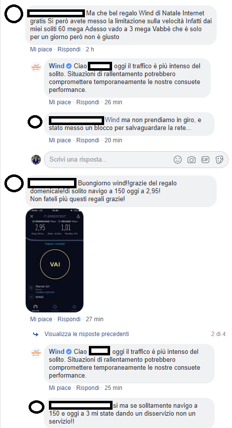 Wind giustifica il limite di velocità a 3Mbps perché oggi 9 Dicembre 2018 il traffico è più intenso