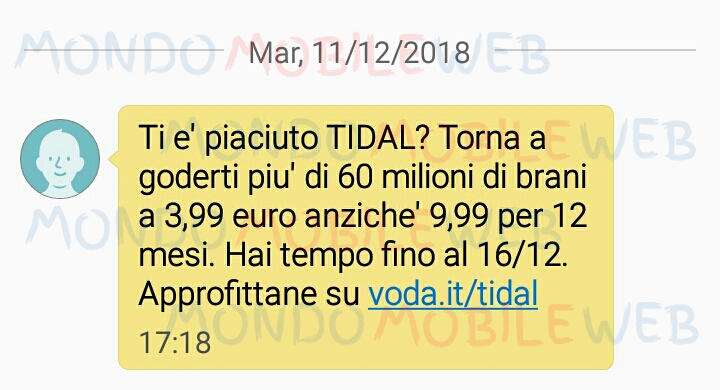 Come indicato nel messaggio, la promozione è attivabile entro il 16 Dicembre 2018, salvo eventuali proroghe. Non è escluso che l’SMS sia stato inviato anche a chi aveva provato gratuitamente Tidal Premium con altre promozioni Vodafone.
