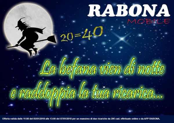 Rabona Mobile, in occasione della festa per la Befana, ha deciso di rilanciare la promozione che permette di raddoppiare il credito ricaricato sulla propria SIM con il taglio di ricarica di 20 euro.