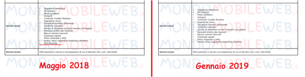 Invece, come MondoMobileWeb è in grado di dimostrare, nei documenti originali il servizio SOS Ricarica figurava nella lista delle funzionalità incluse nell’offerta. Lo stesso succedeva nelle pagine del sito ufficiale, dove la dicitura di questa funzionalità era presente anche nella lista dei servizi inclusi in fondo alla descrizione dell’offerta.