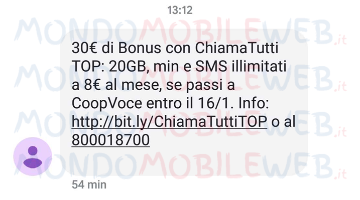 CoopVoce: SMS winback per attivare ChiamaTutti Top con 30 euro di bonus entro il 16 Gennaio 2019