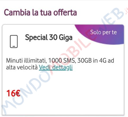 L’offerta tariffaria Vodafone Special 30GB CB non è attivabile da tutti i già clienti e viene proposta con prezzi mensili diversi. In passato è stata segnalata a 6 euro, 9 euro, 10 euro, 11 euro, 12 euro e nelle ultime ore anche a 16 euro al mese. Non è escluso che venga proposta anche ad altri prezzi, più bassi o più alti in base all’offerta di partenza del cliente Vodafone.