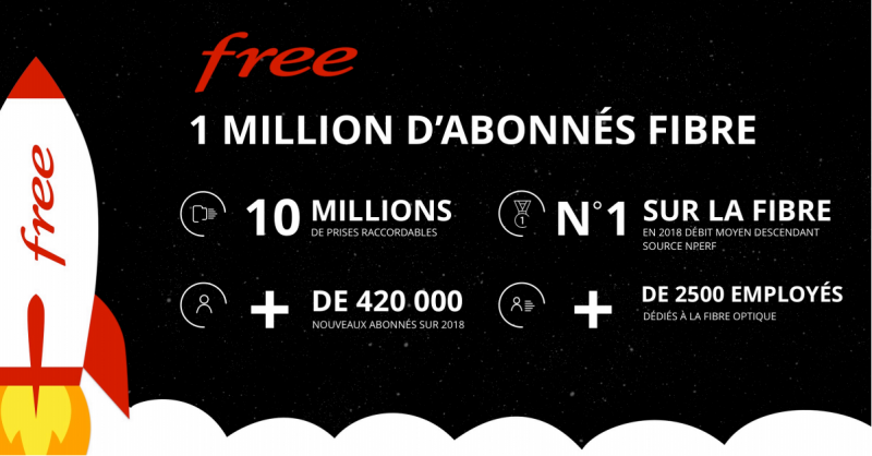 Nel 2018 Free ha effettuato dei grossi investimenti sulla fibra ottica. Questo ha permesso di accelerare la disponibilità di questa tecnologia nel corso dell’anno, e adesso ci sono circa 10 milioni di abitazioni che possono essere allacciate (un incremento del 50% rispetto all’anno precedente).